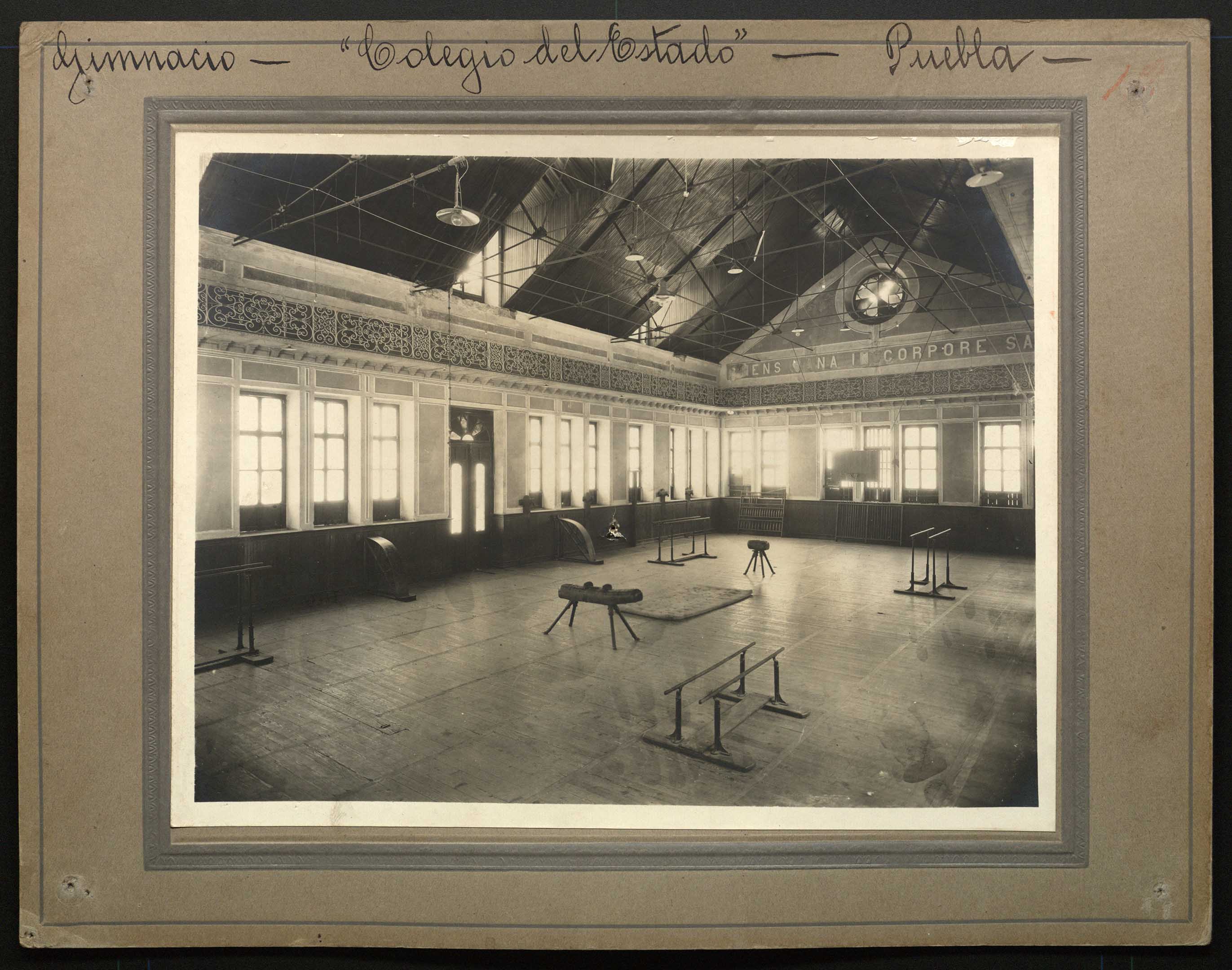 Toma aérea, lateral izquierda del interior del gimnasio del Colegio del Estado; se observan aparatos de gimnasia, en la parte superior del gimnasio a la derecha, se lee: Mente sana en cuerpo sano, en latín; sobre el mismo un vitral circular. Se puede apreciar la estructura del techo y algunas lámparas. En escuadra, se aprecia una puerta orientada hacia la calle Juan de Palafox; las ventanas están orientadas hacia la calle Juan de Palafox y 6 norte, respectivamente