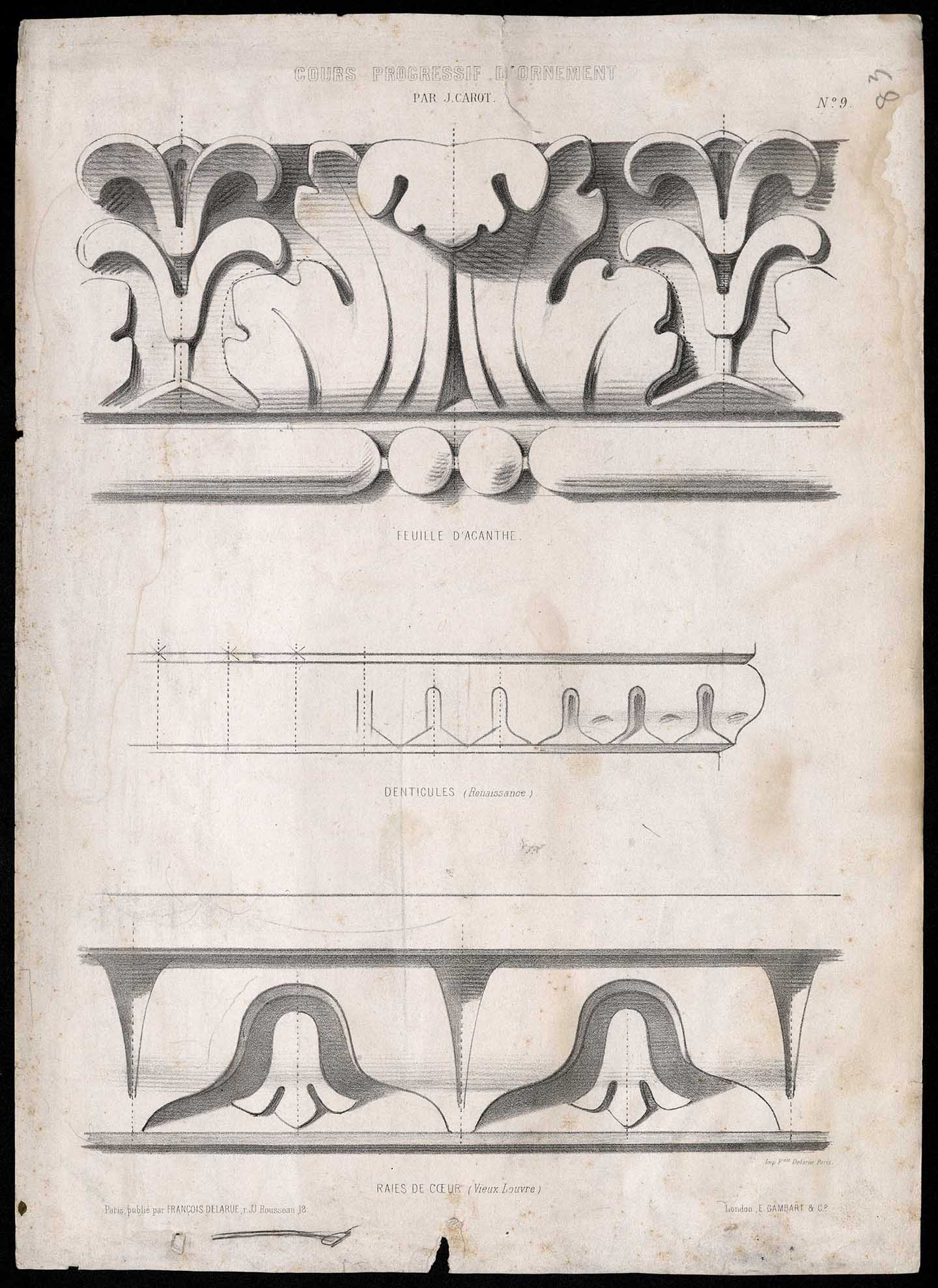 | dc.description.notes | Estampa perteneciente a la obra: Cours progressif d’ornement : composé sur les meilleurs modèles de chaque époque et d'après nature / par J. Carot. Impreso en París por François Delarue y en Londres por E. Gambart & Co. aproximadamente en 1870 | Centro superior: COURS PROGRESSIF D´ORNEMENT PAR J. CAROT. Esquina superior derecha: No. 9. Pie de la primera sección del grabado: FEVILLE D´ ACANTHE. Pie de la segunda sección de grabado: DENTICULES (Renaissance). Pie de la tercera sección de grabado: RAIES DE COEUR (Vieux Louvre). Esquina inferior izquierda: Paris, publié par FRANÇOIS DELARUE, r. JJ. Rousseau 18. Esquina inferior derecha: Imp. F.ois Delarue, Paris. Abajo: London, E. GAMBART & Co. | Manuscrito a lápiz: 83 | |