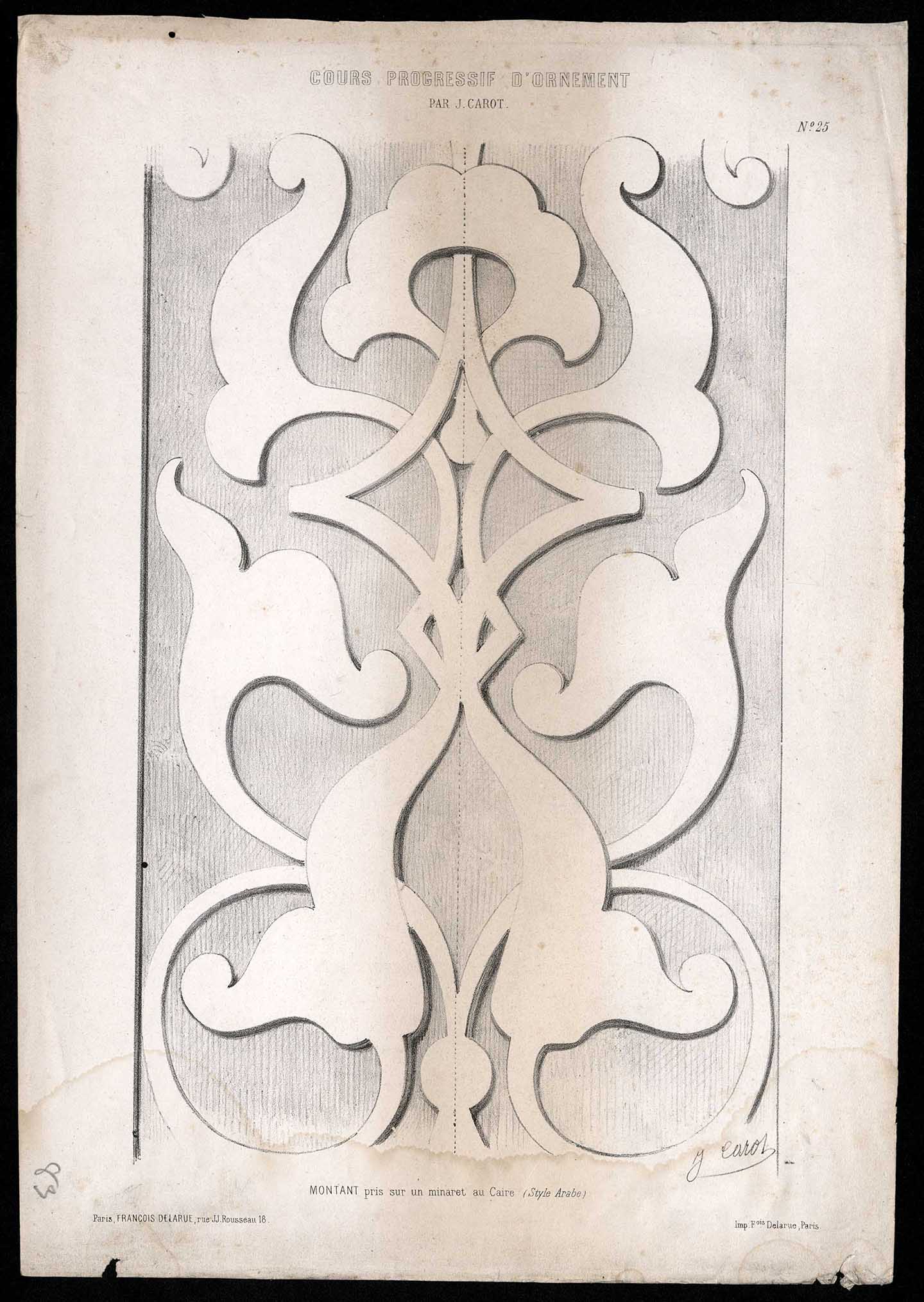 | dc.description.notes | Estampa perteneciente a la obra: Cours progressif d’ornement : composé sur les meilleurs modèles de chaque époque et d'après nature / par J. Carot. Impreso en París por François Delarue y en Londres por E. Gambart & Co. aproximadamente en 1870 | Centro superior: COURS PROGRESSIF D´ORNEMENT PAR J. CAROT. Esquina superior derecha: No. 25. Centro inferior: MONTANT pris sur un minaret au Caire (Style Arabe). Esquina inferior izquierda: Paris FRANÇOIS DELARUE, rue, JJ. Rousseau 18. Esquina inferior derecha: Imp. F.ois Delarue, Paris | Manuscrito a lápiz: 83 | Firmas: J. Carot | |