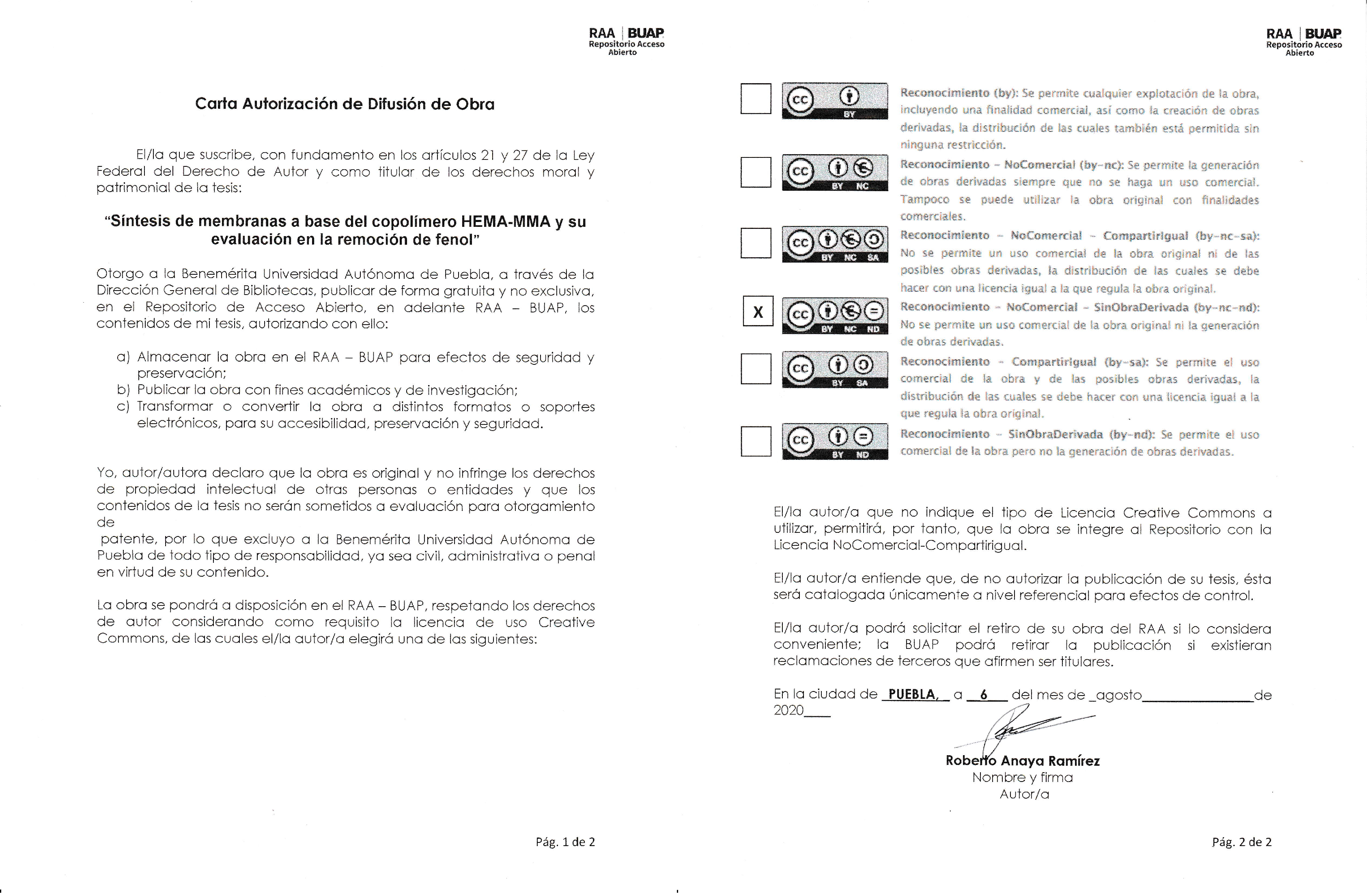 “En este trabajo, se realizó la copolimerización de los mónomeros 2-hidroxietil metacrilato (HEMA) y metil-metacrilato (MMA) en diferentes relaciones molares, manteniendo una proporción mayor del HEMA en todos los casos. El procedimiento de polimerización fue por radicales libres. Con el polímero sintetizado se formaron una serie de membranas planas por el método de evaporación del disolvente El material obtenido fue caracterizado mediante el factor de hinchamiento, FTIR, DSC y TGA. Se realizaron pruebas de permeabilidad y adsorción con soluciones de concentración inicial de fenol de 500 ppm. Del análisis de los resultados, se determinó la tendencia a mejorar la permeabilidad del material a base de HEMA, con la adición de pequeñas cantidades de MMA durante la etapa de polimerización, esto conlleva a reducir la adsorción del fenol en la superficie de la membrana y favorece el desempeño del material a largo plazo.”