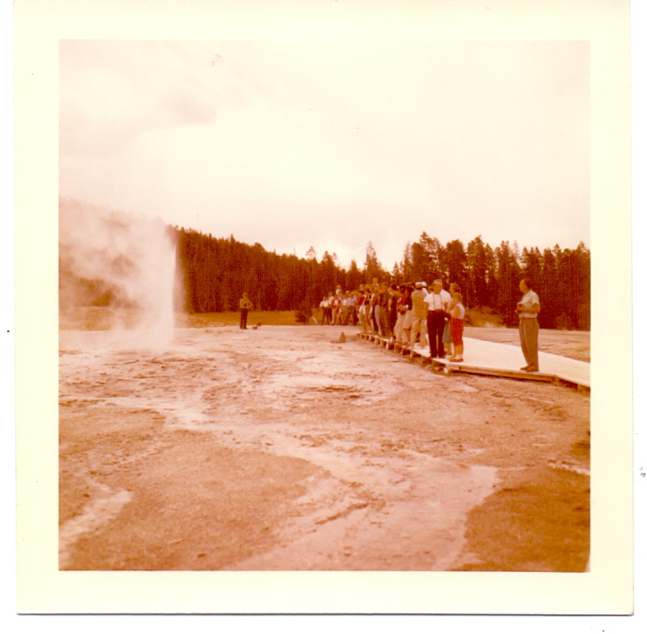 Grupo de personas contemplando un Géiser, Parque Nacional Yellowstone, Wyoming, Estados Unidos