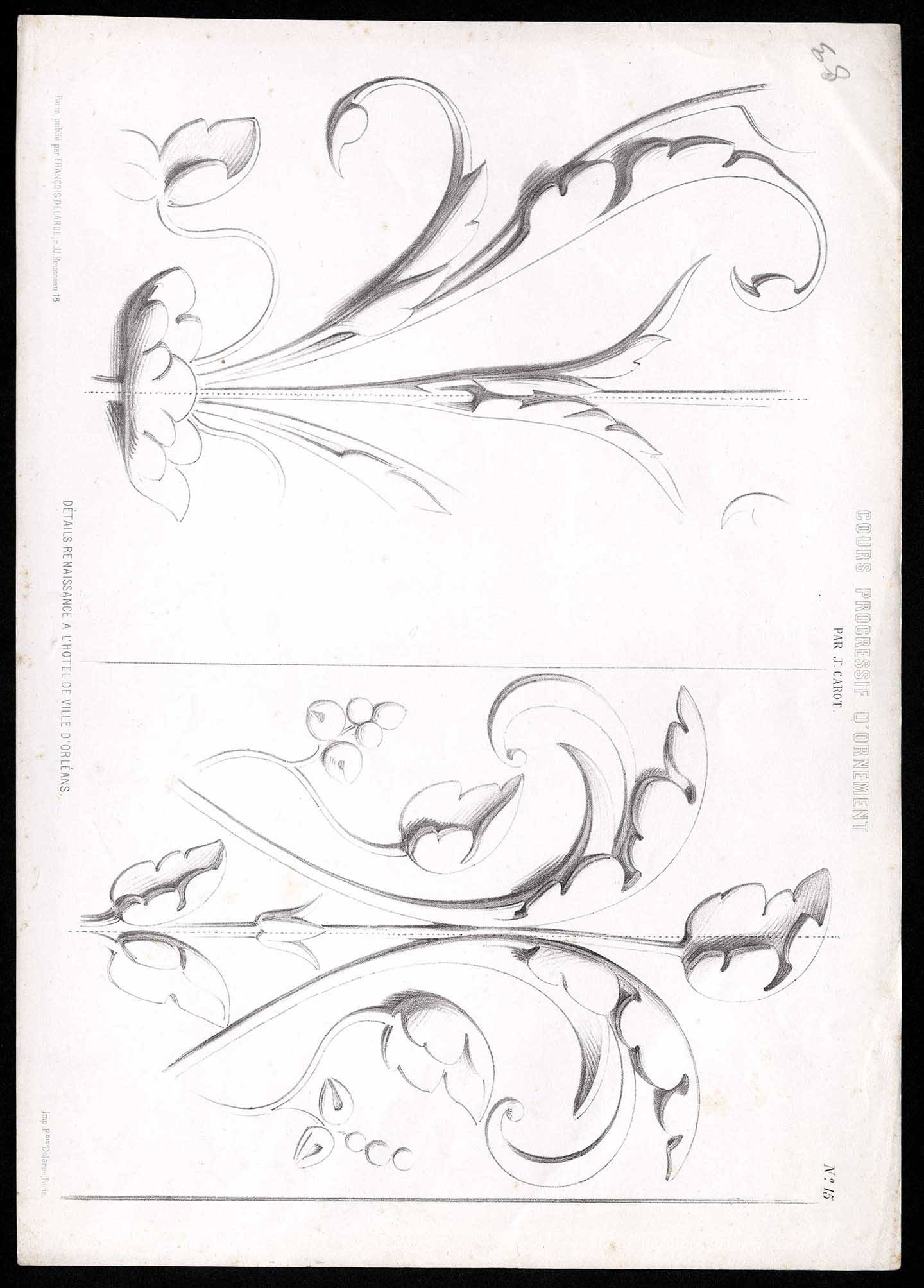 Litografía con dos secciones verticales. La primera representa un motivo vegetal con hojas estilizadas. Segunda sección: hojas de acanto con frutos, representados simétricamente