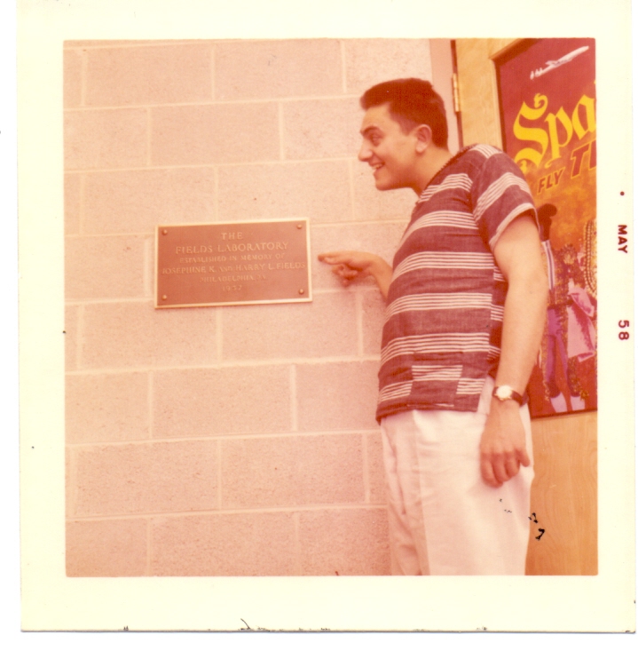 Hombre señalando placa, "The Fields Laboratory" , Philadelphia, Pennsylvania