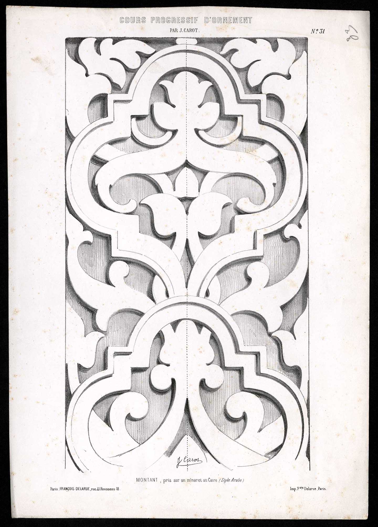 Motivos vegetales decorativos gótico geométricos, enmarcados en una superficie rectangular con simetría de abatimiento, en donde dominan las formas tremoladas que se combinan con otras como las flamígeras, asemejando llamas.