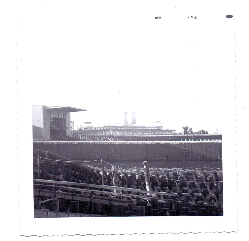 Barco, puerto, postes de luz electricos, edificio y personas a lo lejos