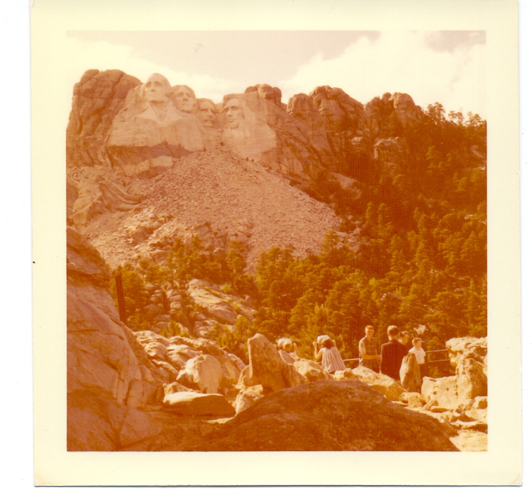 Grupo de personas de excursión, montañas con los rostros de los presidentes al fondo