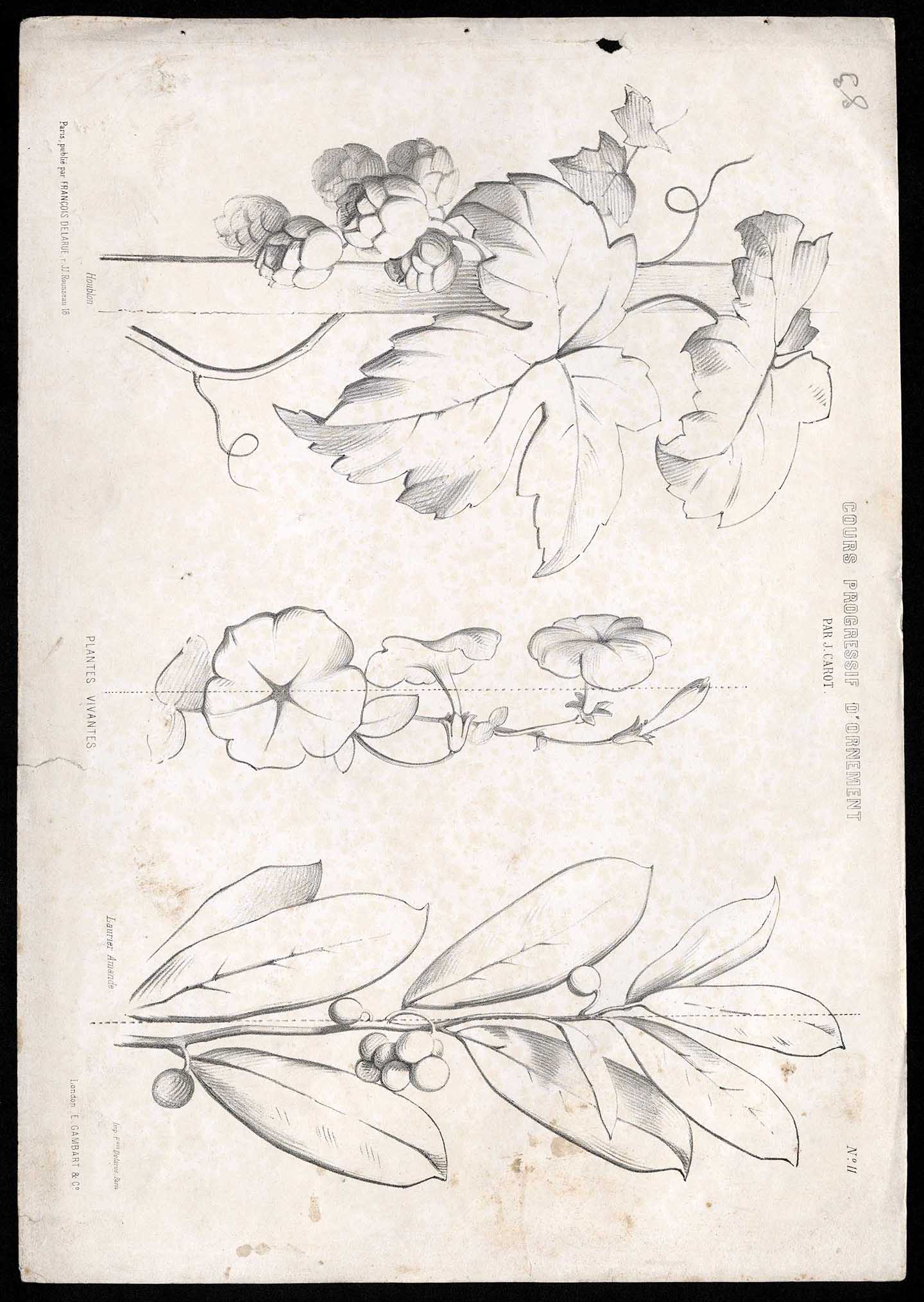 Litografía imagen izquierda planta de lúpulo con sus flores. Imagen central, representación de una planta floreciendo. Imagen derecha, laurel cerezo con racimo de frutas