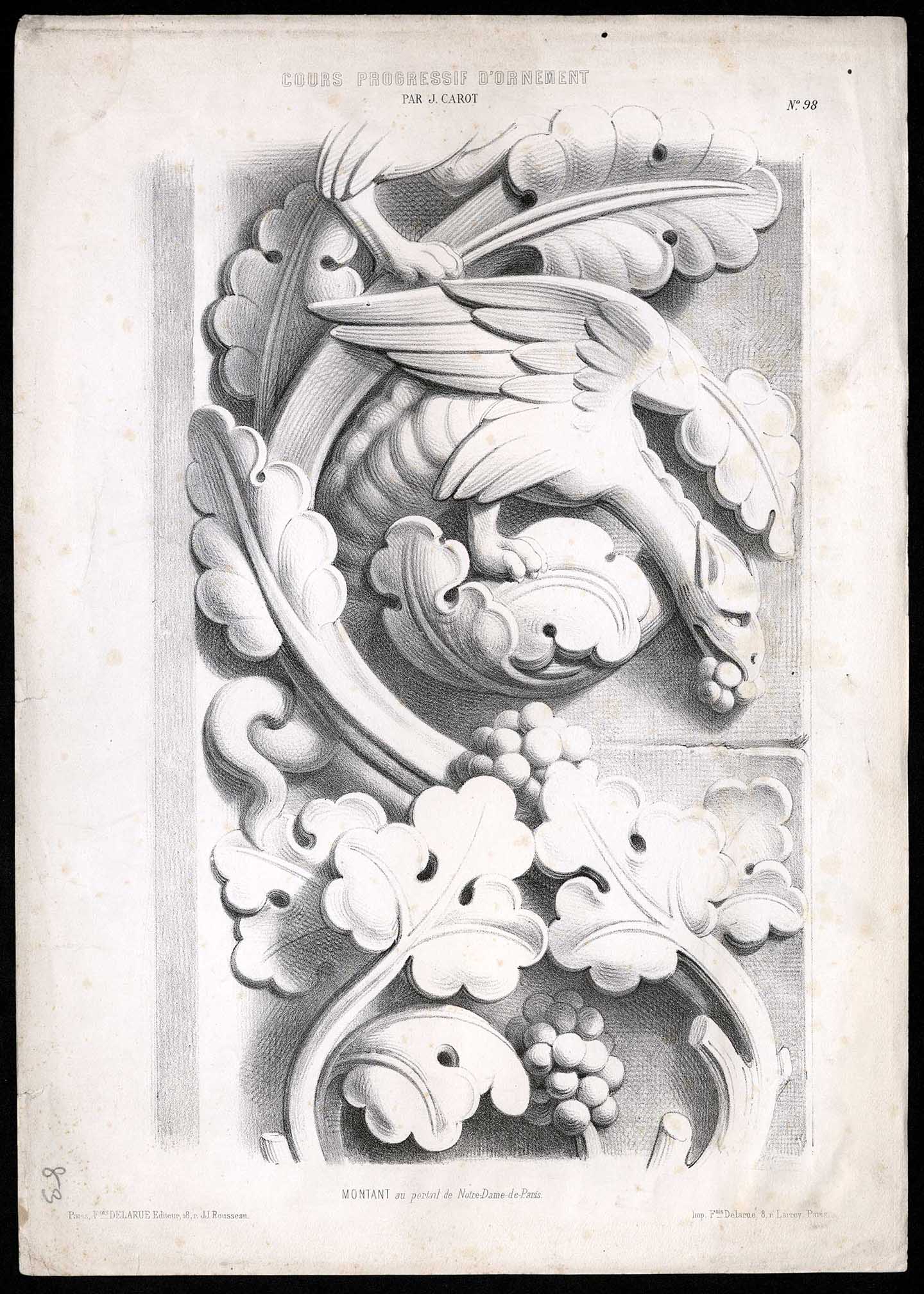 Litografía con motivos vegetales, hojas acorazonadas trifoliadas con representacion ascendente, tallo que parte desde el extremo inferior con hojas oblongas lobulada con tendencia ascendente y que realiza un roleo dejando en la parte central a un dragón o ave grotesca manteniendo en su pico un fruto sorosico