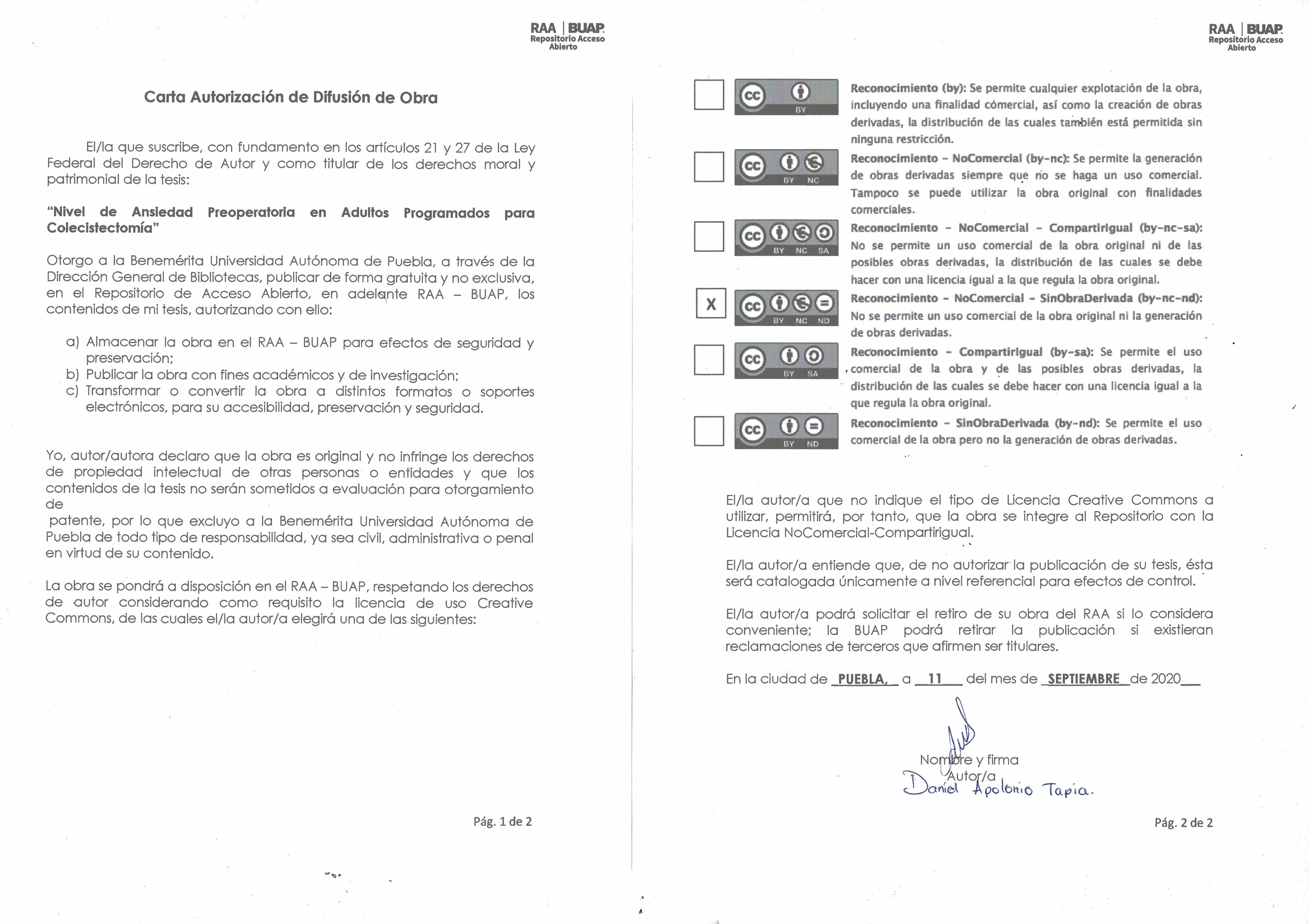 “La ansiedad preoperatoria se define como "un estado desagradable de inquietud o tensión que es secundario a un paciente que está preocupado por una enfermedad, hospitalización, anestesia y cirugía, o lo desconocido". A nivel fisiológico, en los pacientes preoperatorios, trae consigo aumento de la actividad cardiovascular, de la presión arterial, de la tasa de consumo de oxígeno tisular, taquicardia vasoconstricción periférica, diaforesis palmar, dilatación pupilar, reducción de las funciones digestivas, entre otros. Identificar la ansiedad preoperatoria en adultos de 18 a 59 años programados para colecistectomía en un hospital de segundo nivel del estado de Puebla. Será un estudio descriptivo-transversal y se aplicará la escala de ansieda preoperatoria e información de Ámsterdam para la medir la variable de ansiedad. La población serán adultos de 18 a 59 años. El análisis estadístico se llevará cabo mediante el programa SPSS versión 22.0, se obtendrá el índice de confiabilidad alfa de Cronbach, se usará estadística descriptiva, medidas de tendencia central y dispersión, así como el Chi- Cuadrado, los resultados serán presentados por medio de tablas y gráficas. Se basará en ley General de Salud en materia de investigación para la ética del estudio.”