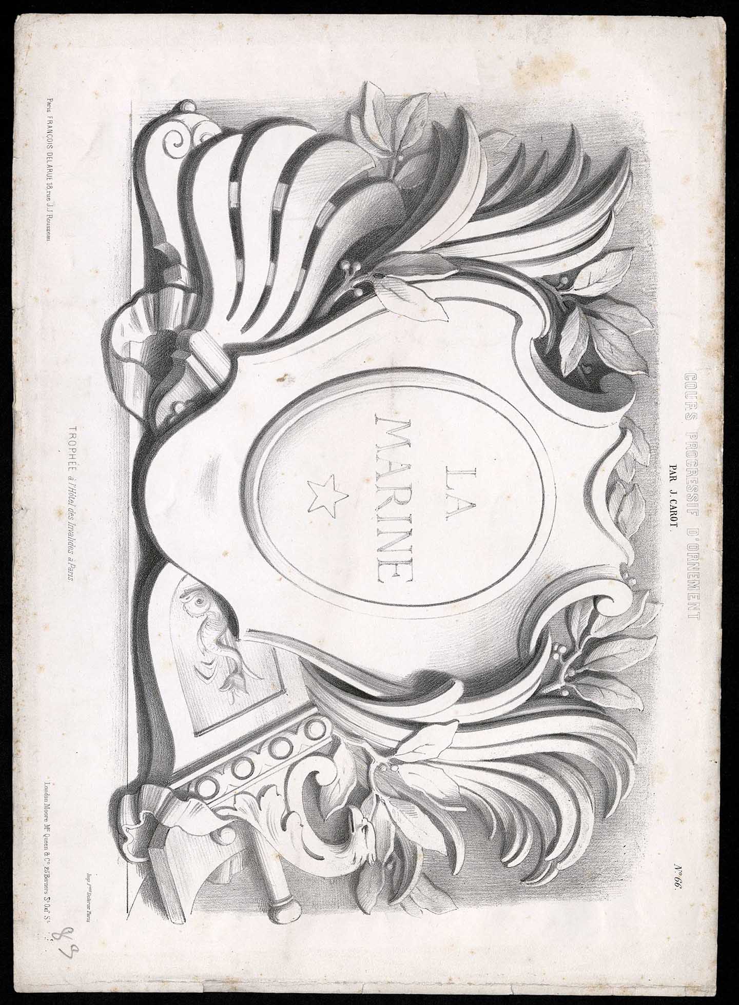Trofeo de armas con leyenda LA MARINE, en la parte baja estrella de cinco puntas, rodeada en los extremos por palmetas y hojas estilizadas con tendencia ascendente, puesto sobre un sable envainado ornamentado con una combinación animalística de ave y animal marino, el brocal con una cabeza de águila, seguido de un delfín con tendencia descendente