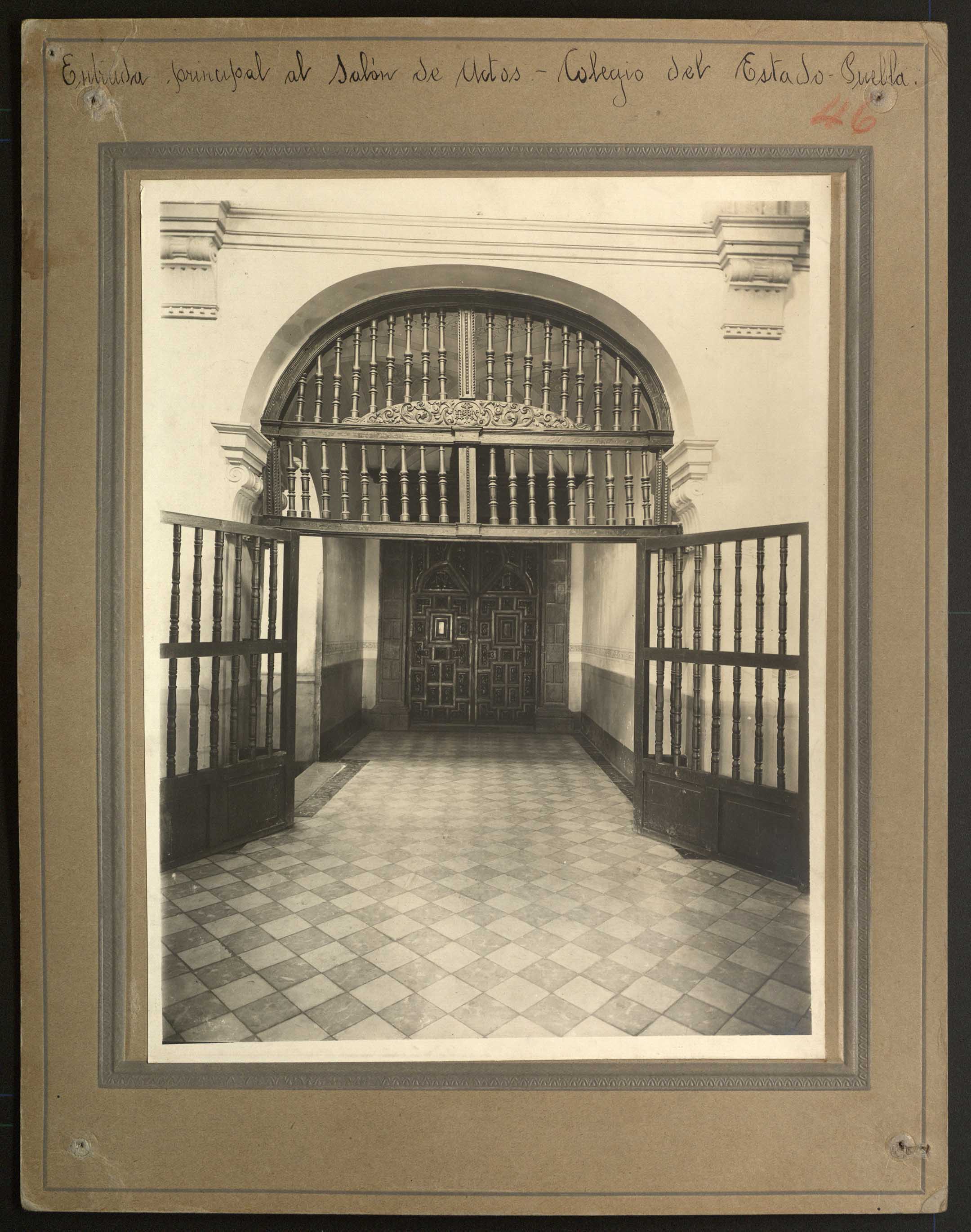 Se observa el Vestíbulo y la entrada principal al salón de actos del Colegio del Estado, actualmente salón Paraninfo, Se aprecia una celosía de medio punto, con barrotes de madera torneados, así como dos hojas que integran una reja. Al fondo la puerta tallada a mano. A los costados se aprecian los capiteles de lo que constituyen dos columnas
