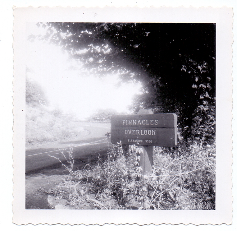 | dc.description | Carretera rural, follaje ambos lados del camino. Letrero con leyenda "Pennacles Overlook, Elevation 3320" | |