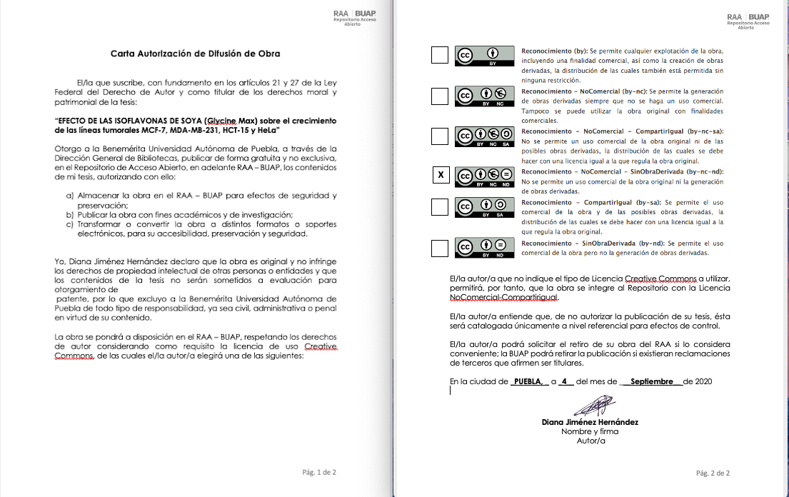 “El objetivo de esta investigación fue determinar el efecto de las isoflavonas de soya presentes en un nutracéutico, sobre el crecimiento de las líneas tumorales MCF-7 y MDA-MB-231 de cáncer de mama, HCT-15 de cáncer de colon y HeLa de cáncer cervicouterino. Se emplearon dos lotes de un nutracéutico comercial de isoflavonas de soya, la presentación del nutracéutico es en cápsulas de las cuales únicamente se empleó el polvo. El polvo fue sometido a una digestión simulada, posteriormente se determinó la presencia de las isoflavonas, mediante la cuantificación de compuestos fenólicos totales, cromatografía en capa fina, espectrofotometría UV/Vis y su actividad biológica se determinó mediante la cuantificación de su capacidad antioxidante. Posteriormente, se sembraron 5, 000 células por pozo en cajas de 96 pozos, de cada una de las líneas celulares tumorales en el medio de cultivo correspondiente; posteriormente, se adicionaron concentraciones crecientes de isoflavonas de soya como compuestos fenólicos totales de 20 a 220 μM y se incubaron por 24 horas. Finalmente empleando el reactivo XTT se determinó el efecto antiproliferativo y la dosis letal media sobre las líneas tumorales MCF-7, MDA-MB-231, HCT-15 y HeLa. Los resultados obtenidos mostraron que las isoflavonas de soya mantuvieron su integridad y funcionalidad, después de una digestión simulada.”