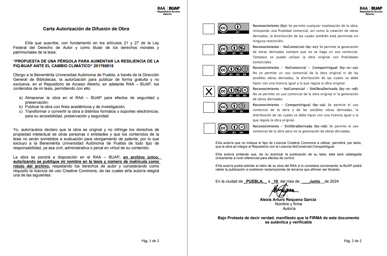 "El aumento de las temperaturas globales, el estrés por calor y la disminución de la calidad del aire son problemas que impactan directamente a la salud y el bienestar de las personas que viven en áreas urbanas y periurbanas. En materia de sostenibilidad, la BUAP a través del Manual de Sostenibilidad 2025 declara en su Compromiso Institucional 6 que se compromete a desarrollar hábitos en la comunidad Universitaria que estén directamente relacionados con el entorno inmediato de los estudiantes y como resultado reflexionen y modifique valores y actitudes que condicionan su comportamiento y relación con el entorno, mientras que en el Compromiso Institucional 7 declara que se requieren cambios organizacionales de conducta, de pensamiento y de visión. El objetivo es elaborar una propuesta de diseño de pérgola con la implementación de plantas enredaderas de 3 especies distintas para el tramo del andador que corre del Edificio FIQ 1 hasta el Acceso 3 (Av. San Claudio) para aumentar la resiliencia de la FIQ ante el cambio climático".