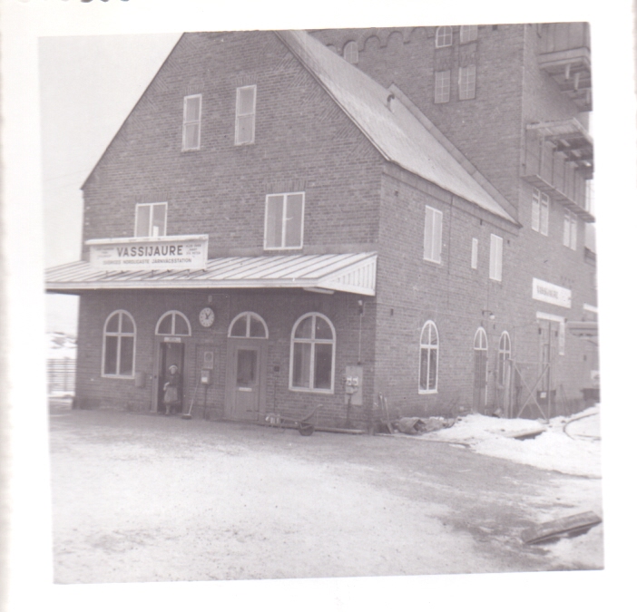 Edificio alto, ventanas, mujer parada justo en la puerta, nieve de lado derecho