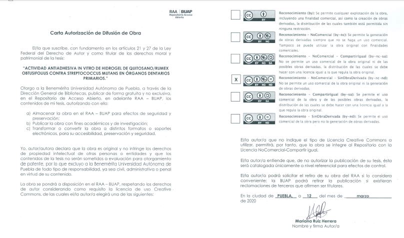 “El presente trabajo describe la actividad antiadhesiva contra Streptococcus mutanscde una formulación novedosa de hidrogel de quitosano con Rumex obtusifolius al 1% en la superficie de órganos dentales primarios. La potencial actividad antiadhesiva de algunos extractos orgánicos de plantas medicinales y/o fitomoléculas son de gran interés como alternativa en el tratamiento de la caries dental, con pocos efectos secundarios. En este sentido, el gel de gluconato de clorhexidina (perioxidin) es usado como un agente antiadhesivo en control de la caries actualmente, que limita el crecimiento de microorganismos cariogénicos omo S. mutans en la cavidad bucal, aunque causa alteración en la sensación del sabor, erosión de la mucosa bucal, pigmentación y efectos perjudiciales en los tejidos y puede causar resistencia bacteriana. El Hidrogel de quitosano/extracto etanólico Rumex obtusifolius posee actividad antiadhesiva contra S. Mutans CDBB-B-1455 a los 20 y 60 minutos en medio de cultivo Mitis Salivarius y Sacarosa y Fosfato. Se llevó a cabo la caracterización del gel por microscopía electrónica de barrido y FTIR. Aunque se sugiere continuar con estudios de biocompatibilidad, el Hidrogel de quitosano/extracto etanólico Rumex obtusifolius puede ser una alternativa antiadhesiva utilizada como agente preventivo para disminuir la incidencia y prevalencia de caries dental.”