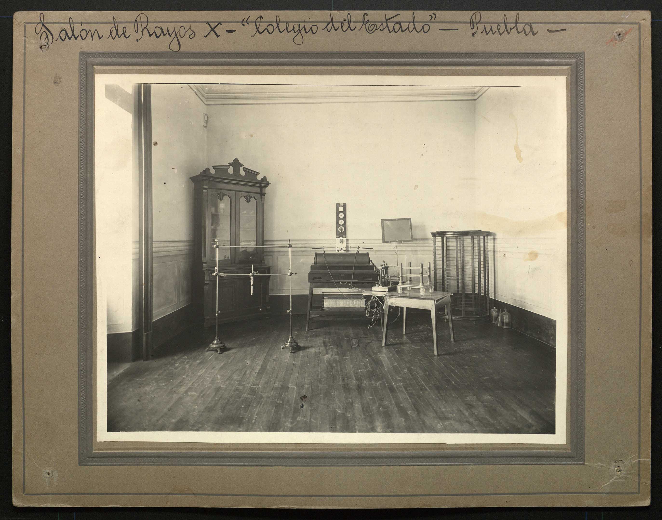 Salón de rayos X del Colegio del Estado. En la pared frontal, a la izquierda, se observa una vitrina, a la derecha se observa una mesa y algunos instrumentos de la época