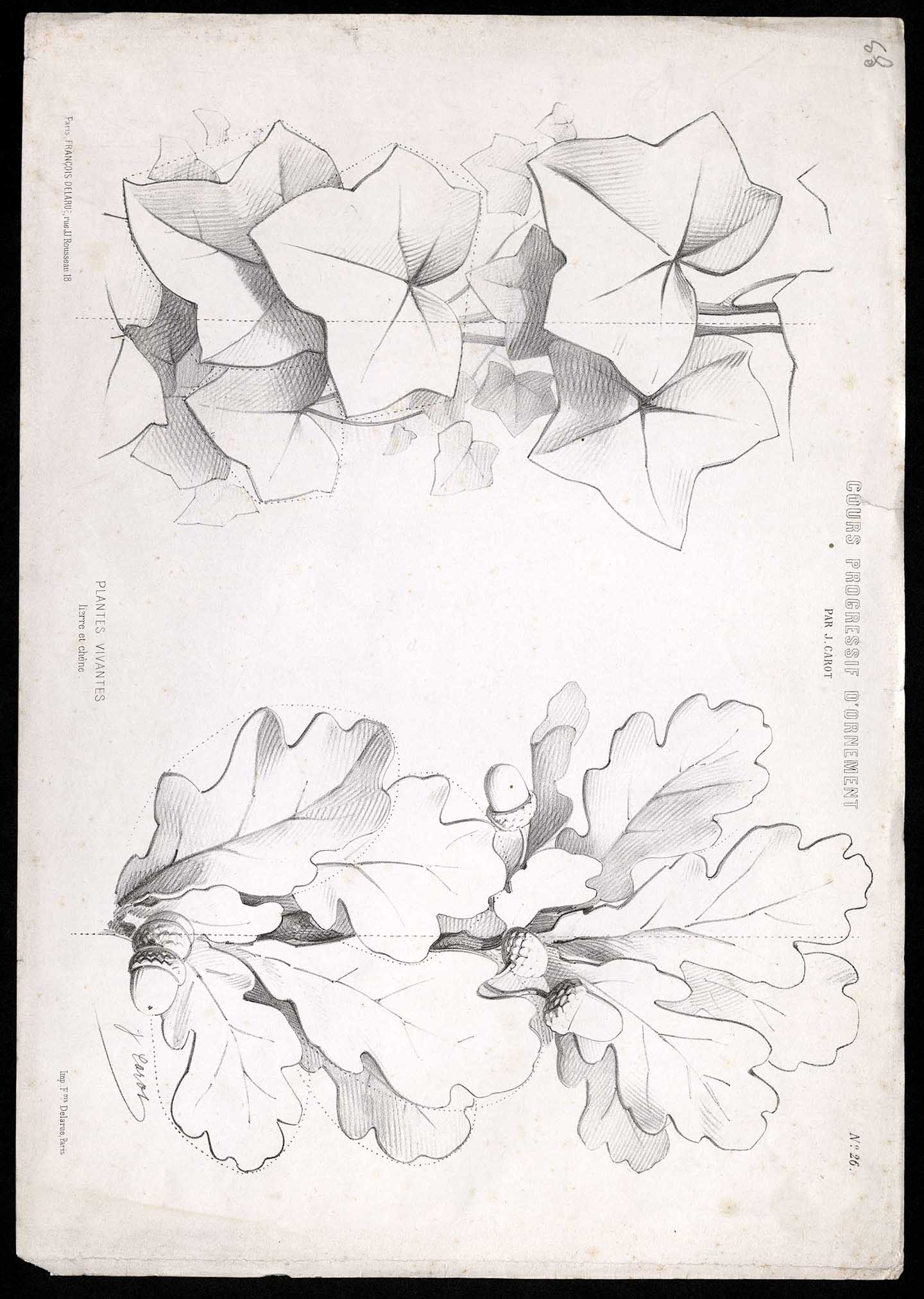 | dc.description.notes | Estampa perteneciente a la obra: Cours progressif d’ornement : composé sur les meilleurs modèles de chaque époque et d'après nature / par J. Carot. Impreso en París por François Delarue y en Londres por E. Gambart & Co. aproximadamente en 1870 | Centro superior: COURS PROGRESSIF D´ORNEMENT PAR J. CAROT. Esquina superior derecha: No. 26. Centro inferior: PLANTES VIVANTES, Lierre et chêne. Esquina inferior izquierda: Paris, FRANÇOIS DELARUE, rue, JJ. Rousseau 18. Esquina inferior derecha: Imp. F.ois Delarue, Paris | Manuscrito a lápiz: 83 | Firmas: J. Carot | |